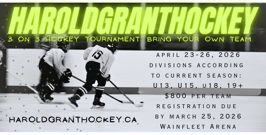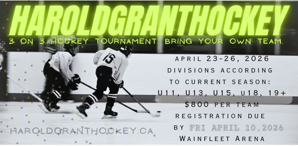 Our 3rd annual 3 on 3 Harold Grant Hockey tournament is April 23-26, 2026. Please head over to the Registration tab to sign up!